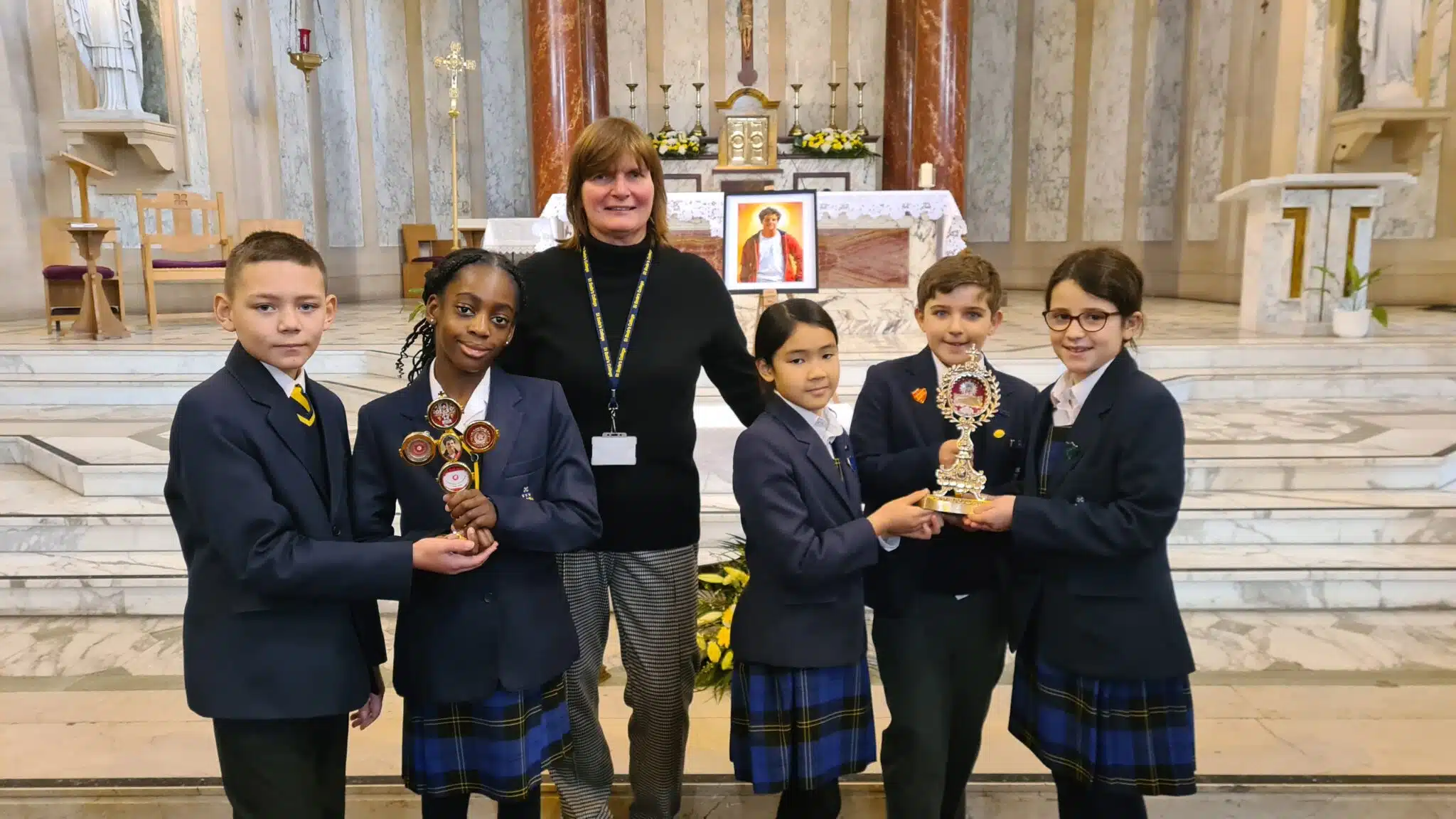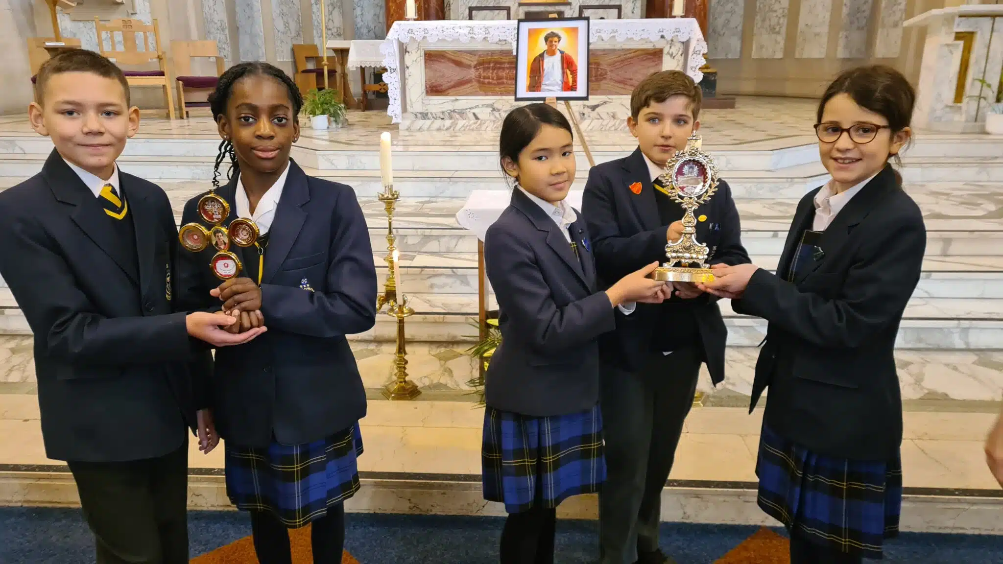 Five Prep 5 pupils were invited to visit the relics of St Carlo Acutis, a holy young man who died in 2006 aged just 15 years old and who was canonised last September. They spent a poignant afternoon at St Patrick’s RC Church in Collyhurst, where they were able to see and hold the special relics. These first-class relics included a piece of Carlo’s pericardium (the membrane around his heart), fragments of his hair displayed in a cross, a piece of his t-shirt and a section of the bed sheet that covered him as he died.